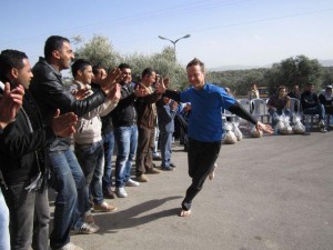 At last! The Run Across Palestine arrived Wednesday at Canaan Fair Trade headquarters near Jenin in the Palestinian West Bank following an ultra-marathon that covered over 100 miles in five days. The six U.S. runners, Claire Everhart, Meryl Marsh, Randi Lyn, David Gardner, Timothy Young and Chris Treter — and media team including Aaron Dennis, Jacob Wheeler and Aubrey Parker and musician Joshua Davis — battled nagging injuries, mountainous terrain, fatigue, and hassling by the Israeli military on Day 1, but made it. A joyous celebration ensued Wednesday afternoon between the American runners and their Palestinian hosts.