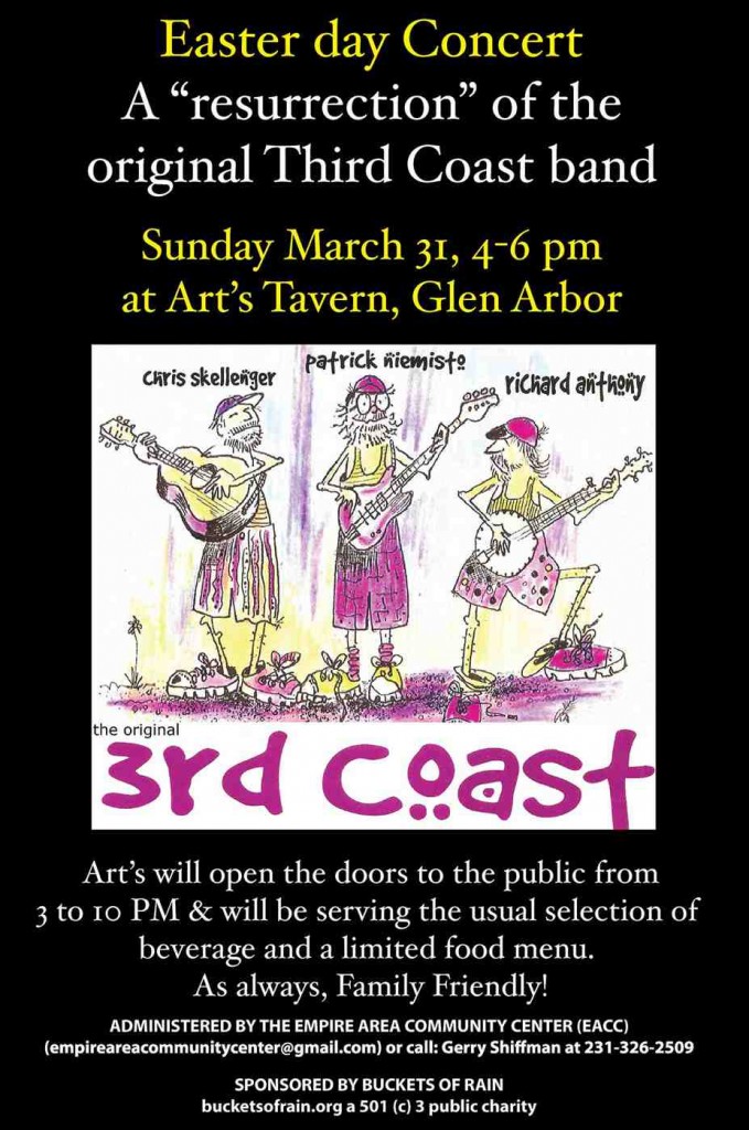 The Empire Area Community Fund’s next monthly concert is scheduled for Easter Sunday, March 31, from 4-6 p.m. at Art’s Tavern in Glen Arbor. The Original members of Third Coast will perform. To learn about this dynamic new community project to help those in need, read here. Last month’s concert raised $55. To learn more about the project, click here.