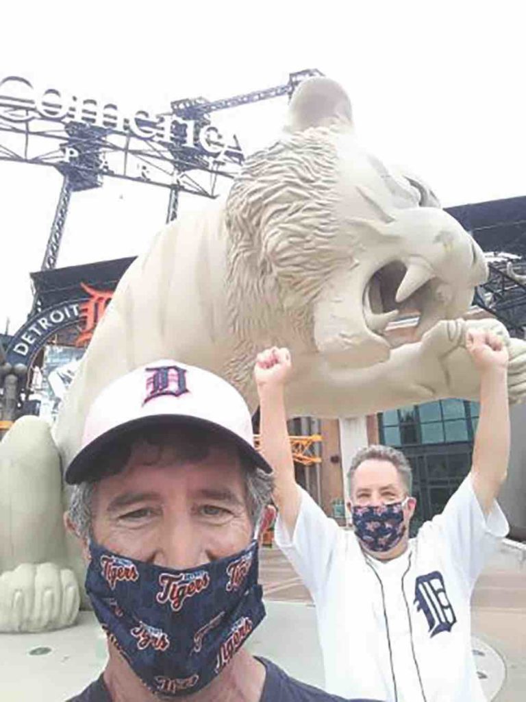 Diehard Detroit Tiger fans Tim Sutherland (l) and Jack Lane (r) showed up at Comerica Park for the home opener on July 27, but of course were unable to get inside the ballpark. Major League Baseball is playing—for now at least—in front of empty stadiums to mitigate the spread of the Coronavirus.