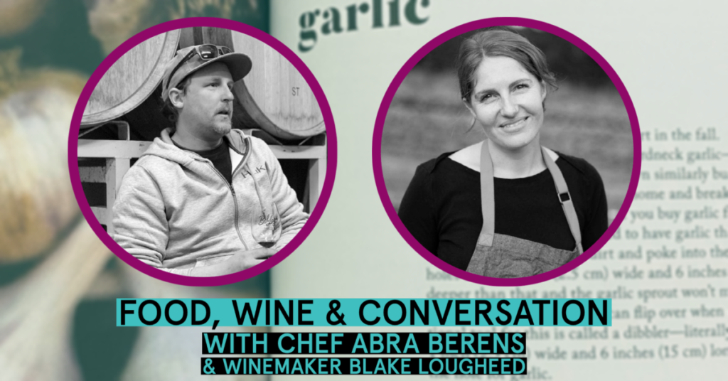 Enjoy a lively conversation surrounding food, wine, agriculture and everything in between as Abra walks you through the preparation of her Garlic Confit with Marinated Beans, and Blake explains the nuances and artistry behind successfully pairing wine with food (he’ll be preparing it for himself as well!)