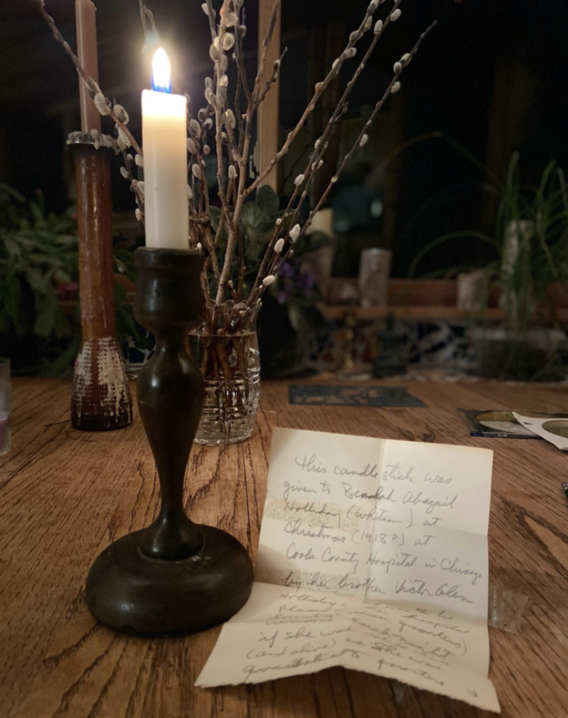 When my Grandma was in training, she went to Ann Arbor for a while to train in the larger hospitals and lo and behold, we had another pandemic, the “Spanish Flu” in 1918. She was sent to Chicago to work at Cook County Hospital in the influenza wards as a very young woman. During those times, of course, quarantine was about the only way to control the spread of the virus and so she was sequestered in the hospital for many weeks. Without the ready use of a phone or other means of communication, her brother Victor gave her this candle stick (featured in the photo) for Christmas to be used as a simple means to let him know that she was OK. Every night after her shift, she would place this candle in the window of her dorm room and light it to let him know that she was OK.