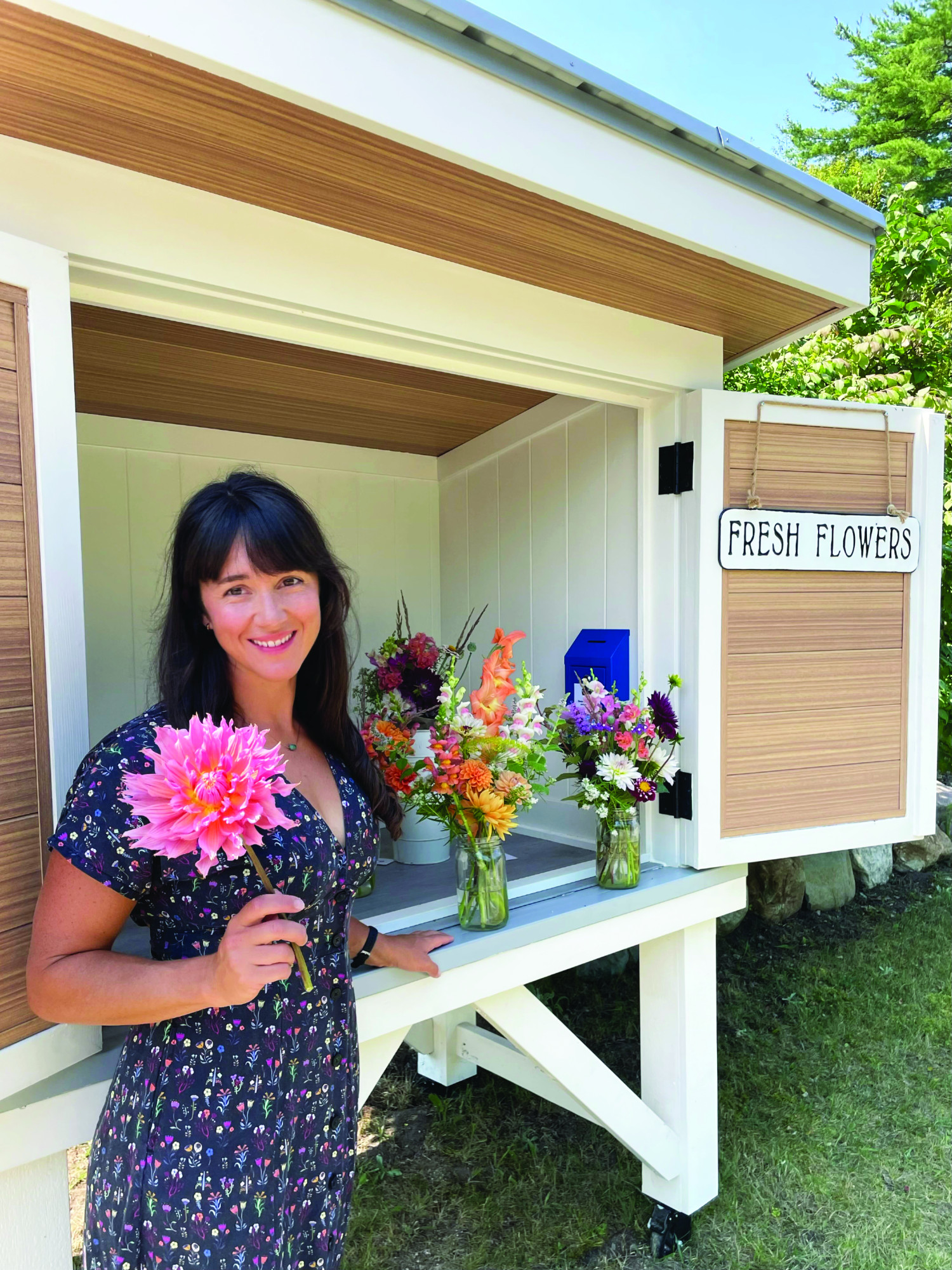 Maddy Ruegg dances with fresh dahlias at her fresh-cut flower stand on MacFarlane Rd. at the bottom of Inspiration Point hill. Learn more on Instagram at @SleepingBearBlooms.