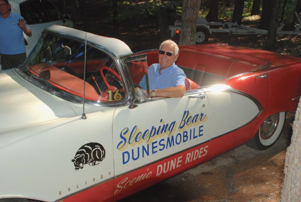 On Aug. 11, family and friends gathered to celebrate this special man on his 90th birthday. While Jack and his son-in-law Bill Carlson fished for perch, Jack’s favorite pastime, a few surprises took shape for his special day. A connection was made through Facebook. Tom Plasman and David Taghon of the Empire Area Heritage Group and Museum, arranged a “chauffered” ride for Jack in Plasman’s 1956 Oldsmobile convertible dune car. The memories of many hours driving tourists across the Sleeping Bear Dunes, telling tales and answering all kinds of interesting questions, flooded back as the ride took Jack and guests back to Glen Haven. Jack finished his career as a dune car driver in a 1965 Ford dune truck, and one was provided for photos by friends Jim and Meghan Munoz, of Manitou Transit in Leland.