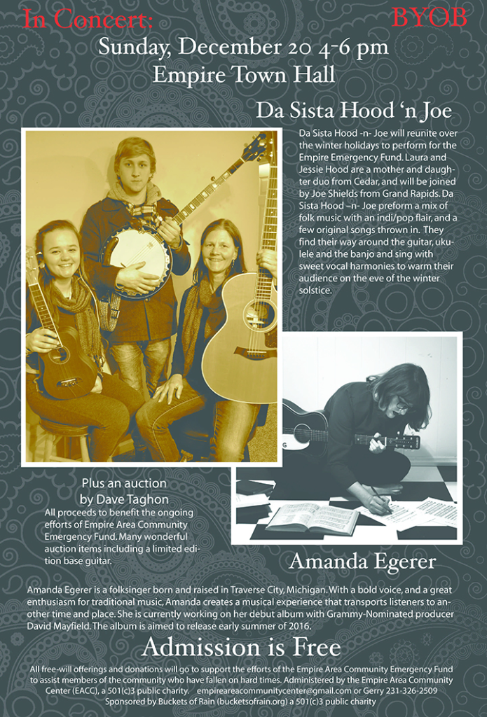 The next Empire Area Community Emergency Fund Concert/Auction will be held Next Sunday, Dec. 20 from 4-6 p.m. at the Town Hall in Empire.