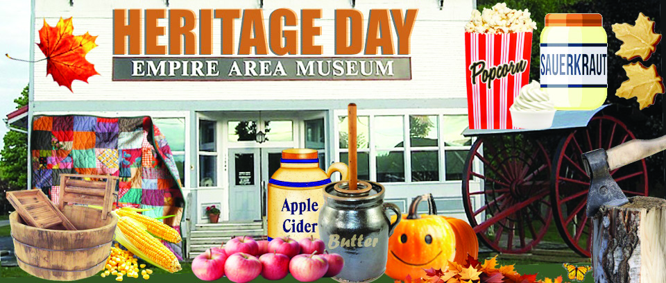 The Empire Area Museum celebrates Heritage Day this year on Saturday, Oct. 11, from 1-4 pm with old-time music and old-fashioned arts and crafts and tricks and treats. Treats include Moomers ice cream, free popcorn and samples of homemade maple sugar candy, sauerkraut cake, apple cider and butter made on site. Exhibits include demonstrations of yarn spinning, hand quilting, rug hooking, chair caning, corn shelling, washboard laundering, sauerkraut making and log cutting.