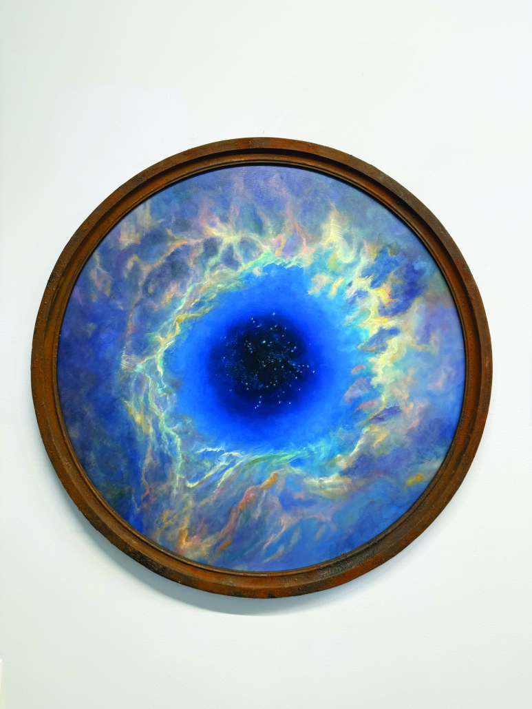“This work was inspired by the shape of the frame, the image of the sky—one that I found aesthetically interesting—and my thoughts about the reality of being on and of this earth[ly] planet. The feeling of turning and rolling when I think about the movement of the universe and universes,” Peet stated.
