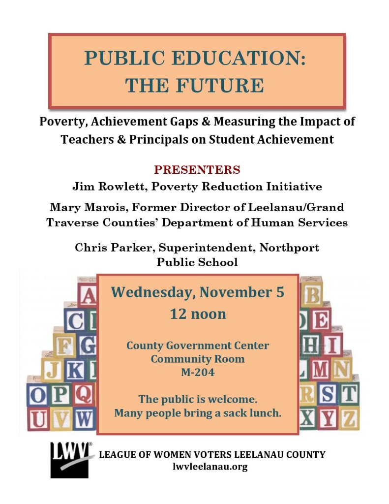 The League of Women Voters Leelanau County will host a presentation on Public Education: The Future on Wednesday Nov. 5 at noon in the lower level public meeting room of the Leelanau County Government Center. The November meeting is the second session of a two-part discussion on public education. The presenters will be Jim Rowlett of the Poverty Reduction Initiative, Mary Marois, former Director of the Leelanau/Grand Traverse Counties’ Department of Human Services and Chris Parker, Superintendent of the Northport Public Schools. The panelists will address the issue of poverty as it relates to schooling and achievement gaps and the impact of teachers and principals on student achievement.