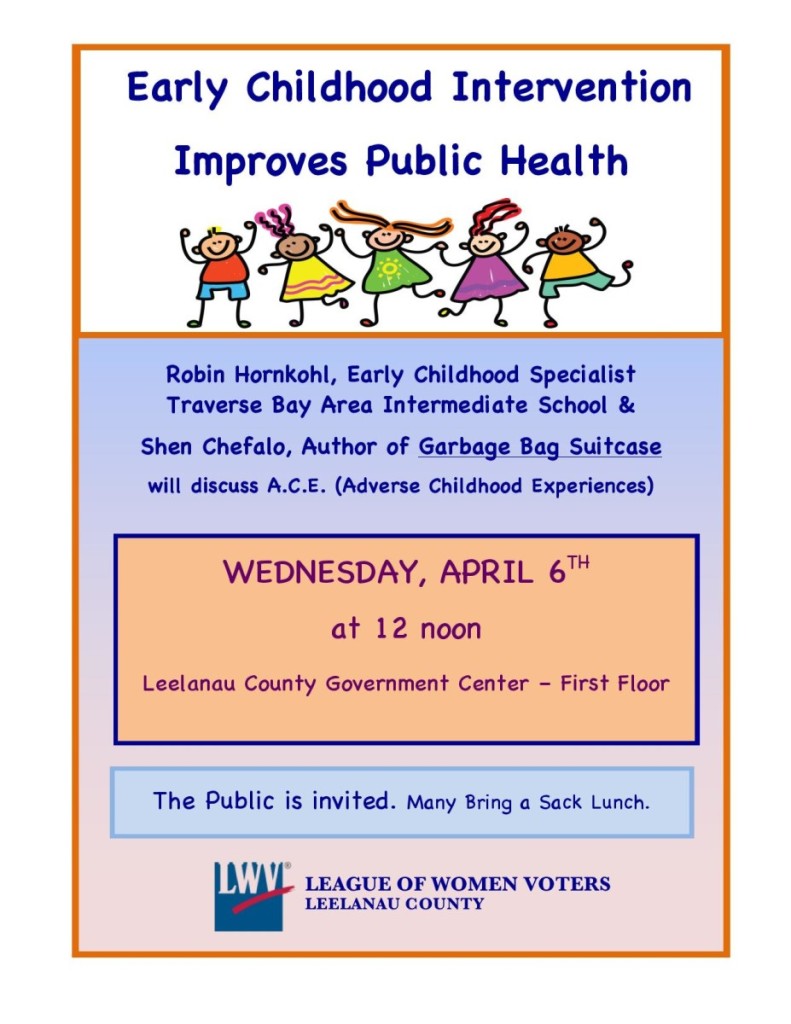 On Wednesday, April 6, at noon at the Leelanau County Government Center the League of Women Voters Leelanau County will host a forum entitled “Early Childhood Intervention Improves Public Health”. Presenters will include Robin Hornkohl, Early Childhood Specialist at the Traverse Bay Area Intermediate School District and Shen Chefalo, author of Garbage Bag Suitcase. The audience will be introduced to Adverse Childhood Experiences (A.C.E) study findings via a video featuring Nadine Burke Harris, a pediatrician who addresses the health consequences of childhood trauma and chronic stress. The forum will then focus on how early intervention can strengthen families to overcome such adversities.
