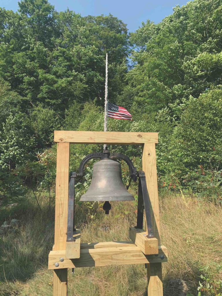 It was 2019 when physical work to restore the island property kicked off. That summer, Seguin built a large, permanent fire ring on the site, complete with a fire grate and locking lid. In 2020, his project was installing a flagpole. By the following year, LPS Board Member Logan Suttman joined forces with Seguin to build a wooden stand on site for a historic bell that many, who are familiar with Leland School in the village of Leland, would recognize. Originally located on the island, the bell spent decades adorning the exterior of the mainland school before the two men moved it back to its rightful home on North Manitou.
