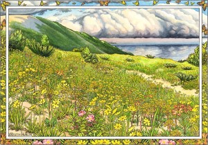 On a hot, sunny midsummer’s day, when Lake Michigan is still cold, a thick fog bank develops just off shore as the day heats up. Then an afternoon wind usually blows the cold mist inland, dropping the temperature and watering the near shore plants. Blooming in a riot of color in sheltered areas, typical dune flowers near Pyramid Point shown here are coreopsis, wood lily, ragwort, hairy puccoon, smooth rose interspersed with juniper and buffalo berry bushes. Wild strawberries are ripe in late June and grow right out of the sand with the other flowers. For a rare Midsummer Day treat — roll a wild strawberry up in a rose petal, and pop into your mouth!