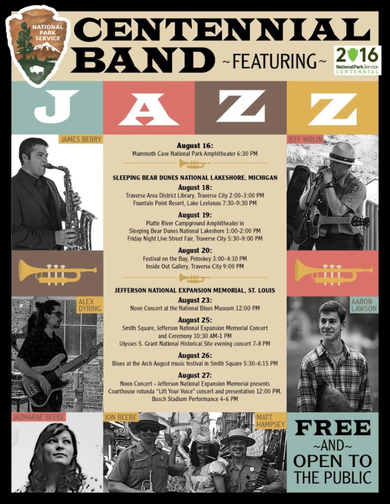 In celebration of the National Park Service’s (NPS) 100th anniversary, Sleeping Bear Dunes National Lakeshore is proud to announce the NPS Centennial Band will perform six shows here in Northern Michigan on their “Find Your Park” tour. On August 18, 19, and 20, the band will play two shows per day, at a variety of venues. The Centennial Band is made up of rangers from New Orleans Jazz National Historical Park, and children’s musician, park ranger Jeff Wolin. The NPS has been called America’s Greatest Idea, and to help celebrate 100 years of providing art-inspiring places all over America, the Centennial Band will bring a little bit of the Big Easy here to the Great Lakes State. National Lakeshore superintendent Scott Tucker is enthusiastic about attending the shows himself, saying “My family and I are very excited for the chance to see these outstanding musicians play the music of America!”