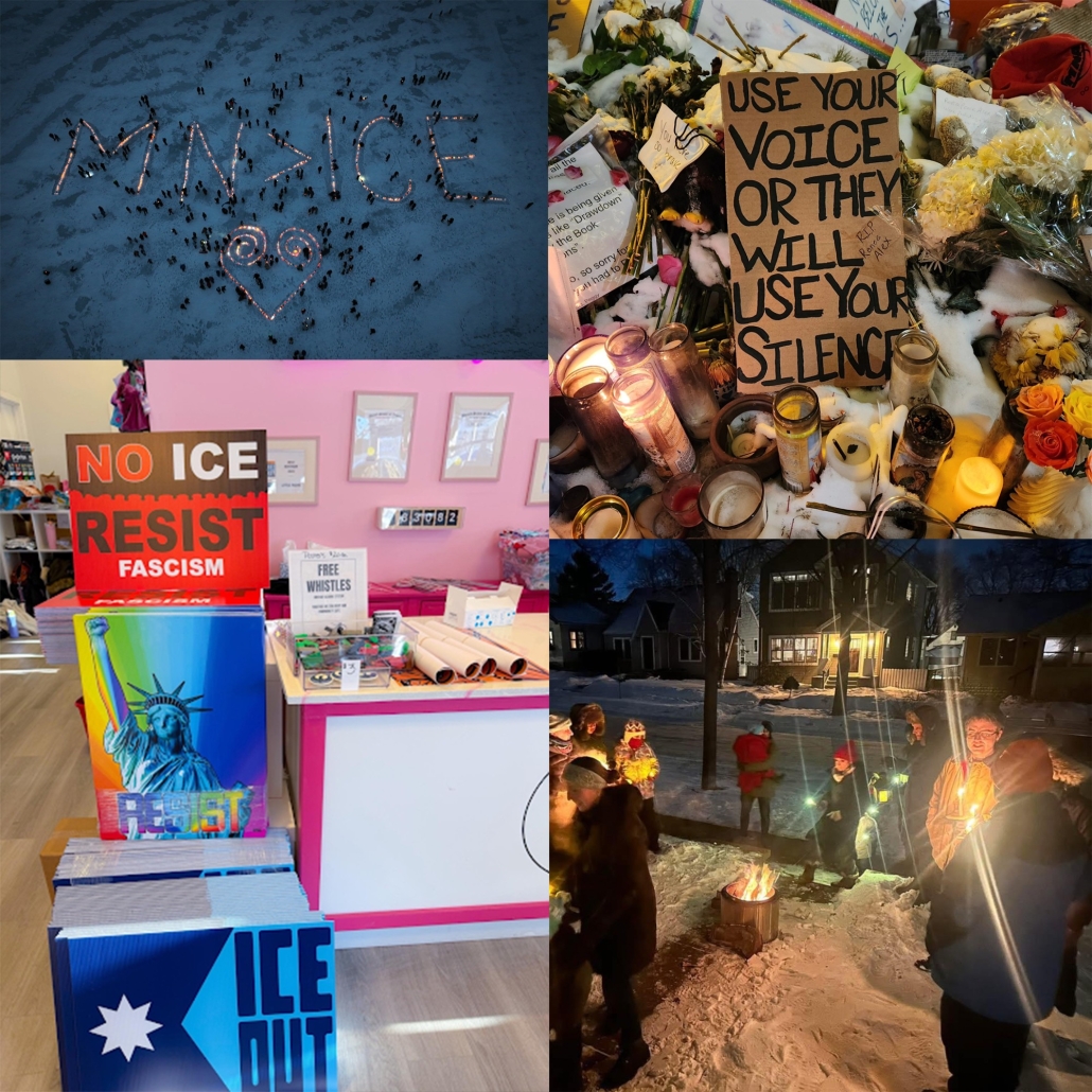 Photos, clockwise from top left: Interfaith leaders and community groups covered St Paul’s Lake Phalen with a traditional Hmong heart reflecting one of the city’s largest immigrant communities (photo by Nenick Vu); Candles at the Alex Pretti memorial site (photo by Catherine Reid Day); Author’s front yard vigil for Alex Pretti on Jan. 24 (photo by Martin Ludden); Shops like Little Roo’s in the Minneapolis suburb of Chaska offer free whistles and sell yard signs (Facebook).