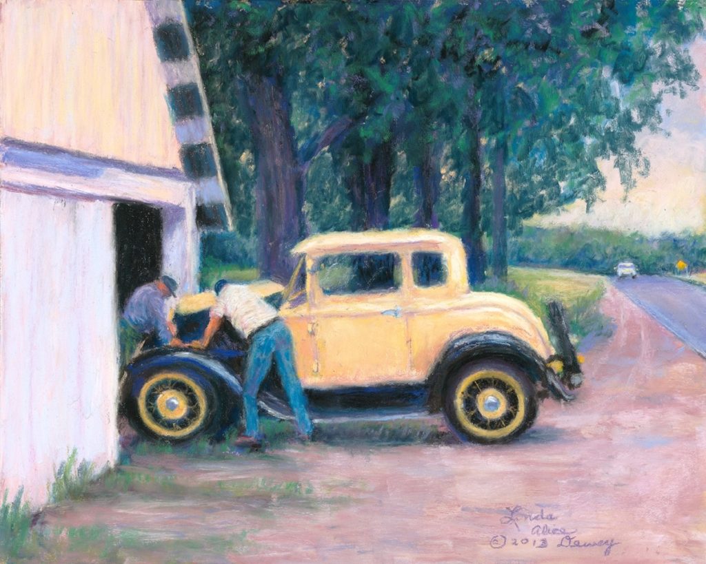 Linda: I started out by selling my matted photographs in gift shops every summer here in Leelanau County. One of them was of an old car with two guys looking under the hood. I had been driving by and had to back up and stop to take the picture. Fifteen years later, I had moved into painting big time, and thought I’d try this painting. When I finished it, I posted it, asking if anyone knew where the pic was taken. I had tried to find it for years. Bunny Lanham replied that it was Duane Newman’s car at his garage on Newman Rd. She gave me their number, and I called them and took it over to give it to them. When I walked in, the matted photograph was on the wall above their TV in the living room! Their daughter had bought it at The Secret Garden in Empire years ago. Duane remembered that day and said he always wondered what happened to me and who I was. I gave them the painting, and Mrs. Newman gave me some chocolate chip cookies and sent a thank you note later. Then I learned that the other fella in the photo and in the painting now was Glen Meteer, the next door neighbor. I learned that from their daughter, a jeweler, who was in an art show with me the next year. Now, that’s a backstory.