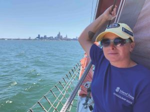 Hancock recently attended the Tall Ship Festival with the Inland Seas (July 7-10), in Cleveland Ohio. Inland Seas was joined by six other ships (both replica and restored) from the United States, Canada, and Spain. These included: Pride of Baltimore II, U.S. Brig Niagara, Empire Sandy, St. Lawrence II, NAO Trinidad, and Appledore IV. “Events like this helps us bring a lot of separate entities to get together to trade stories, and exchange our thoughts and knowledge,” she shared. “Sometimes you sort of can feel like you alone are on an ‘island’ [as the ship]. It helps us to interact together as a connecting community.”