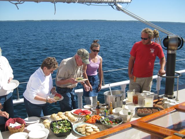 The weekend’s wines were paired with delicious dinners prepared on a wood stove by the Manitou’s chef, Wendy Foss (get to know her food at www.manitoucookbook.com). On Friday night, after we docked in Omena Bay, between the towns of Suttons Bay and Northport on the Leelanau Peninsula, Danielson began the celebration by opening a bottle of local winemaker L. Mawby’s “Sex” sparkling wine, proceeded to a white with hints of salt from Cinque Terre, Italy, wowed us with a sweet Rosé from Toscana and, finally, seduced us below deck with a delicious red table wine, where we enjoyed fresh, southern Italian cuisine of pasta cooked with clams, fresh vegetables and portabella mushrooms. The dinner was simple, yet fresh and tasty. Homemade tiramisu awaited us when we resurfaced above deck and watched the sun set over land just beginning to show the slightest hints of fall colors.