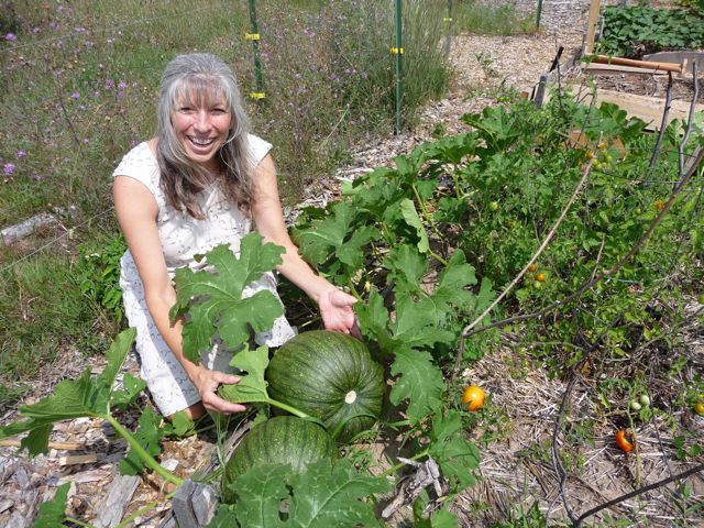 Johnson gamely poses for a photograph next to large and healthy-looking pumpkins planted by New Neighborhood resident Cile Plumstead. Afterward, as she threads herself between horizontal fence wires, her smile is still wide as she adds a final thought: