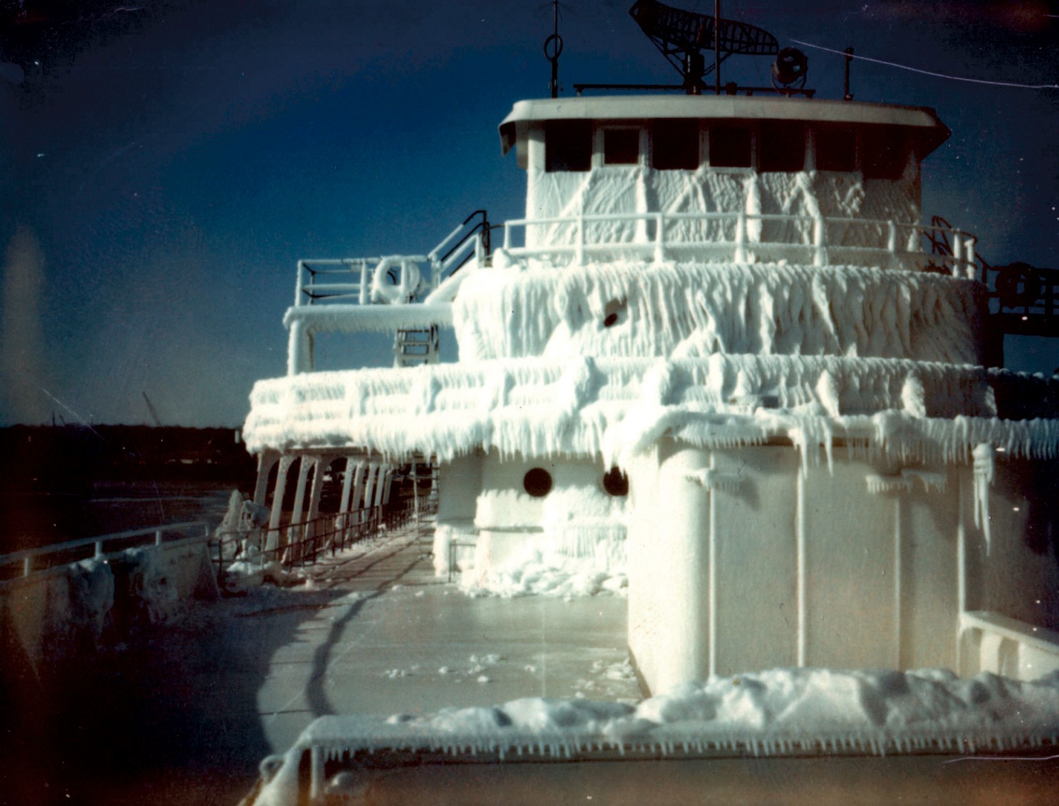 I hurriedly dressed and stepped outside. The wind was howling and nearly swept me down the deck and ladder. I could hear the waves striking the south breakwall and the hiss of spray.