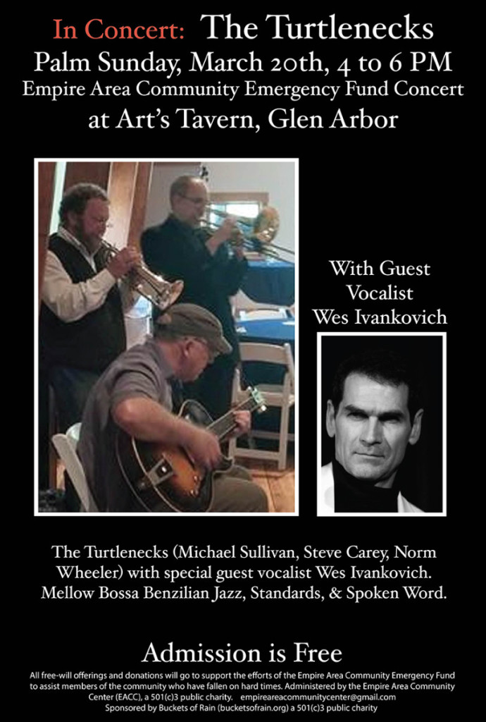 The next Empire Area Emergency Fund concert will feature the Turtlenecks (Michael Sullivan, Steve Carey, Norm Wheeler) with special guest vocalist Wes Ivankovich and take place at Art’s Tavern on Sunday, March 20, from 4-6 p.m.