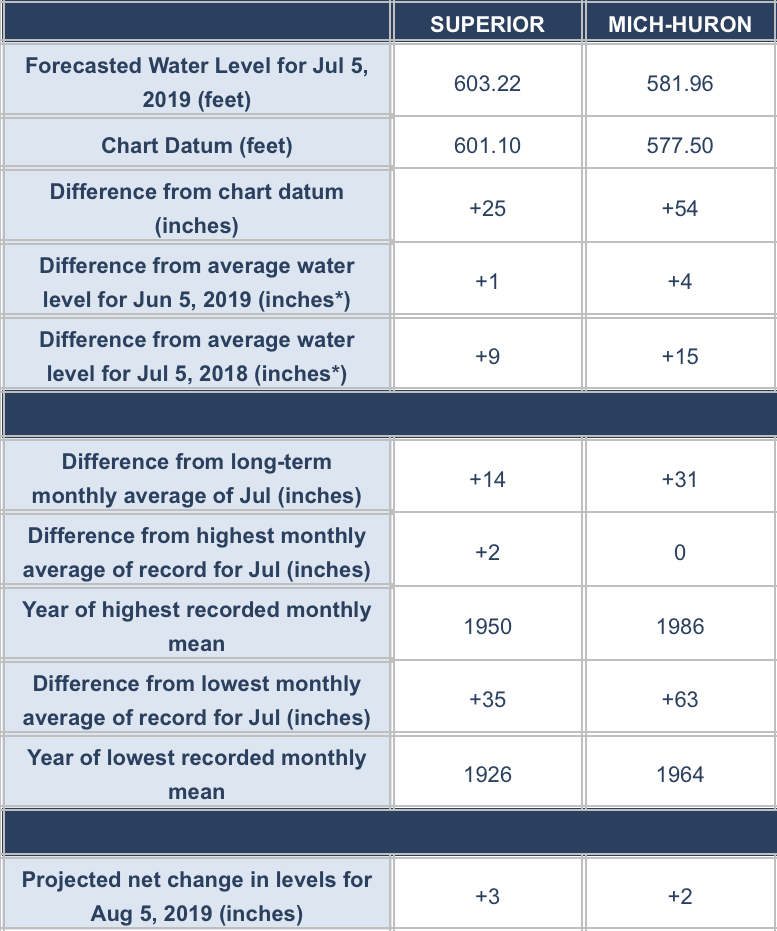 Updated weekly statistics from the US Army Corps of Engineers shows Lake Michigan-Huron (considered the same body of water) water levels reaching an estimated 581.96 feet on July 5. That’s 4 inches higher than they were on June 5 and a whopping 15 inches higher than July 5, 2018. Water levels this month are 31 inches higher than the long-term monthly average for July. They are currently on par with the previous year of the highest recorded monthly mean, which was 1986.