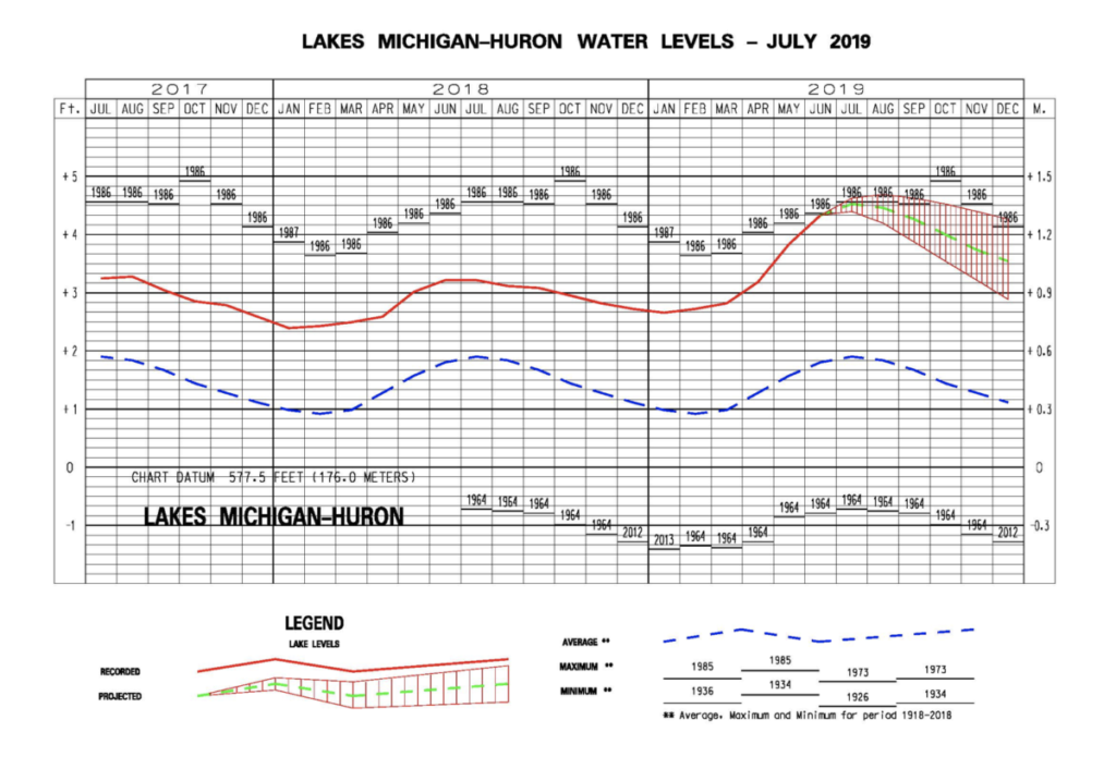 Updated weekly statistics from the US Army Corps of Engineers shows Lake Michigan-Huron (considered the same body of water) water levels reaching an estimated 581.96 feet on July 5. That’s 4 inches higher than they were on June 5 and a whopping 15 inches higher than July 5, 2018. Water levels this month are 31 inches higher than the long-term monthly average for July. They are currently on par with the previous year of the highest recorded monthly mean, which was 1986.