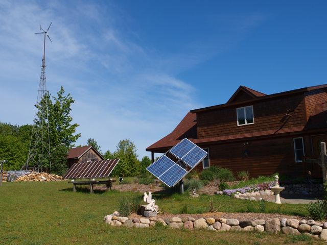 Tim Johnson’s windmill and solar panels at his house in Centerville Township, which he says generate 90 percent of the energy he uses.